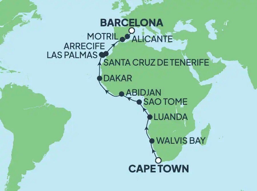 Deze twee aaneengeschakelde cruises vormen samen één doorlopende reis: van de geurige ylang-ylang op Mauritius tot de tapasbars van Barcelona. 43 dagen op zee, 2 werelddelen, 1 onvergetelijk avontuur.